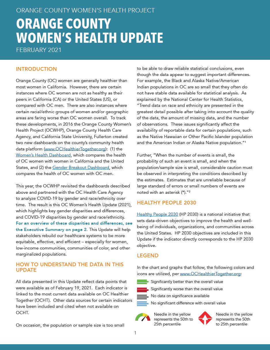Released March 2021, the Orange County Women's Health Update highlights key health and COVID-19 disparities by gender and race/ethnicity in Orange County.